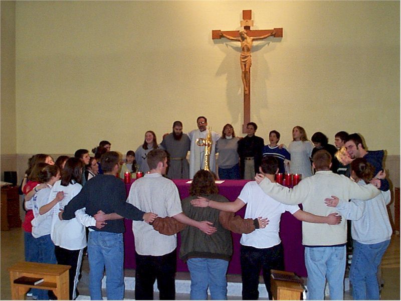 The Children of the King Road Crew does just that! During the past year, many of our teens in the parish youth group have gathered together in prayer in order to put together a presentation that reaches to the very hearts of other teenagers. They have decided to do this because they want other teens to experience the peace, joy, mercy, and love that they have experienced in their lives as a result of committing themselves to Jesus Christ. The Road Crew ministry consists of short witnesses and teachings by teens who have experienced conversion in their lives and have developed deep personal relationships with Christ. It also consists of some comical skits to "break the ice", contemporary Christian music, and a dramatic presentation which truly reaches to the very hearts of the teens who are gathered. This dramatic presentation is followed by a commitment prayer to Jesus Christ where the teens are invited to commit themselves to Christ and to let go of the sins in their lives which are burdening them.
